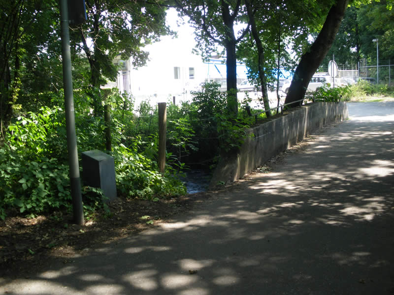 Nu de weg blijven volgen langs het sportcomplex van S.V. Meerssen. De weg gaat over in een voetpad. Dit voetpad volgen, op de T splitsing naar rechts, en om het Sportpark heenlopend komt u vanzelf uit bij een houten brug over de Geul. Op deze brug ziet u een plaquette met: