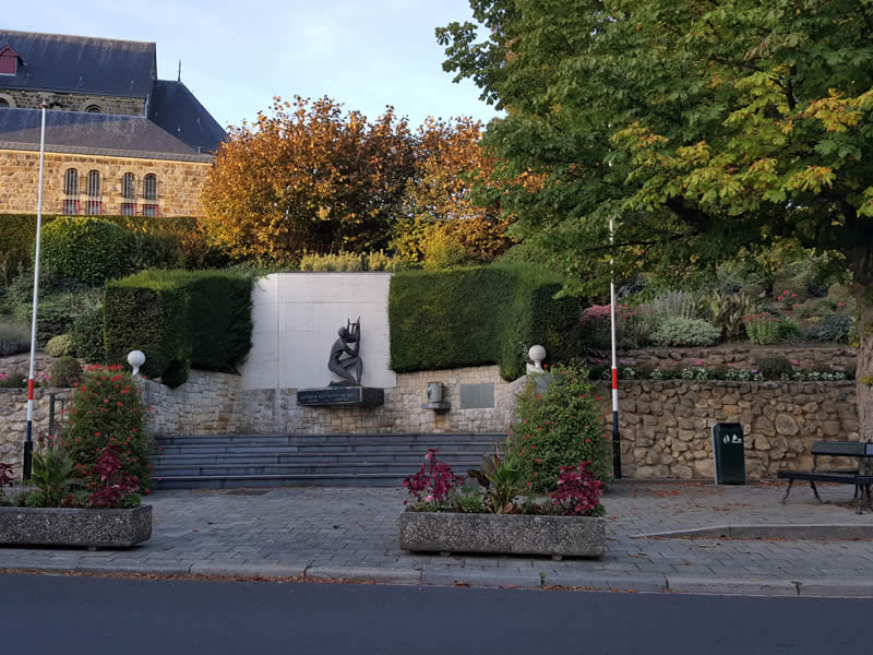 Achter de bank rijst hier de kerk hoog op. Overziet het dorp, de bomen en het gedicht. Zittend op de bank lijkt de tijd even stil te staan. In de verte fluit een stoomtrein en stuwen de machines de rijtuigen verder van je af. Verder weg in het verleden. De toeter van een auto haalt je uit je mijmeringen . Wandelaars dalen de steile trap af langs het kerkhof. Ze blijven even staan, kijken en wijzen. De slag van de torenklok verjaagt hun stemmen. Dan vervolgen ze hun weg in de richting van de Geul, met de stroom mee, die zich even ondeugend verstopt achter witte geveltjes en er zo af en toe tussendoor piept.