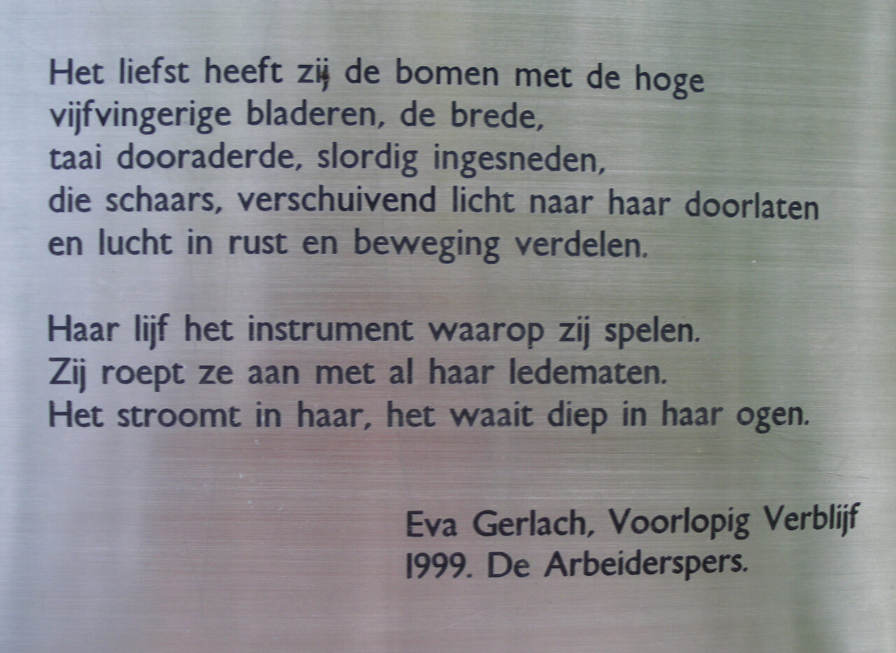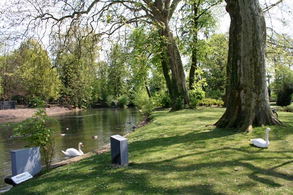 Eenden peddelen onverstoorbaar voorbij. Voederen mag niet, alleen in het water, wat ongetwijfeld natte voeten zal opleveren. Een fontein stuwt haar waterpluimen onophoudelijk de hoogte in. Een kleine boom probeert zich staande te houden op de oever. Op de achtergrond wacht het “Proosdijklooster” verlaten gelaten op haar nieuwe bestemming. Het werd er neergezet door dezelfde man die de “Gloriëtte” liet bouwen. Van daaruit heb je een goed zicht op deze fraai aangelegde Engelse landschapstuin.