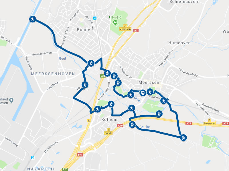Vanaf station Meerssen: met het station in uw rug gaat u linksaf de Pr. de Beaufortstraat in. Na c. 200 meter slaat u linksaf richting sportvelden (Proosdij-voetpad). Bij de brug over de Geul staat zuiltje 6.